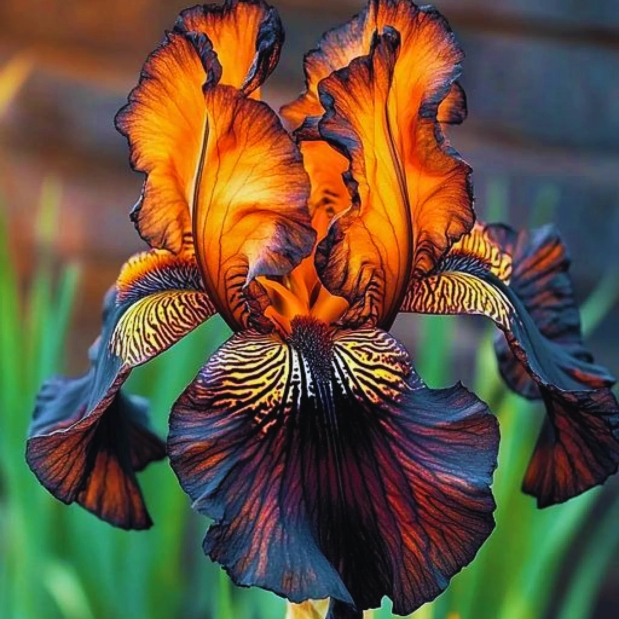 Marginile negre evocă stânca topită ce se răcește în flăcări, creând o floare care nu e doar o podoabă, ci o flacără înghețată, prinsă între lumină și întuneric. Se spune că acest iris răsare acolo unde pământul a fost zguduit de forțele ascunse ale naturii – un simbol al renașterii și al puterii primordiale.