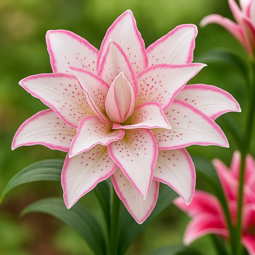The Roselily Anouska is a double oriental lily variety, notable for its large, white flowers with distinct pink edges. These flowers not only add a touch of elegance to the garden, but are also pollen-free , making them ideal for bouquets and floral arrangements, without the risk of staining clothes or furniture. Gardenia +2 berbeeus.com +2 planterra.ro +2