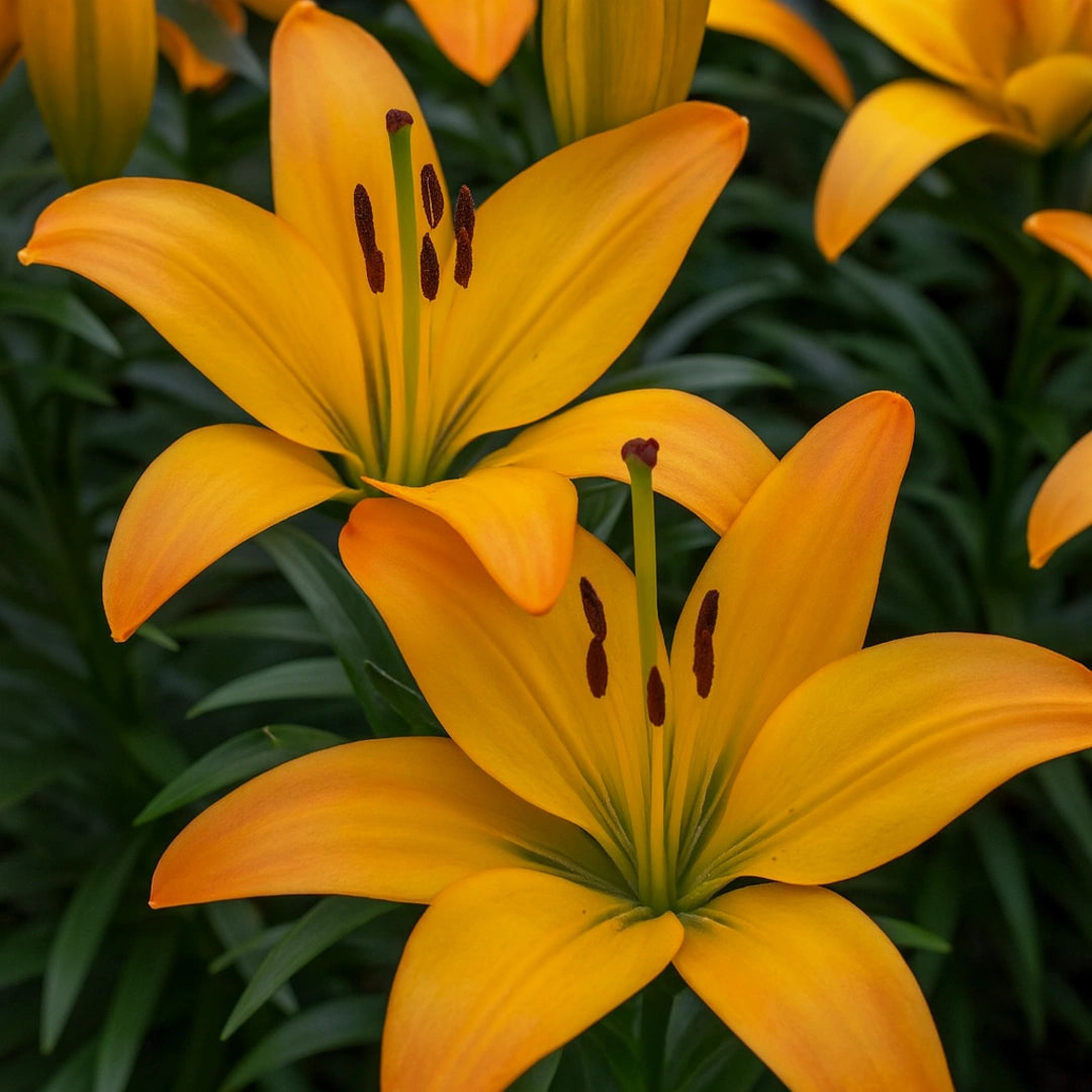 Crinii "Gold Twin" sunt o alegere excelenta pentru cei care isi doresc o gradina luminoasa si plina de viata. Fiecare bulb produce pana la 8 flori mari, duble, de un galben auriu intens. Aceste flori nu contin polen, fiind ideale pentru persoanele alergice. Crinii "Gold Twin" prefera locurile insorite sau partial umbrite si solul bine drenat. Udarea se face regulat, mai ales in perioada de inflorire. Pentru o crestere optima, se recomanda aplicarea unui ingrasamant specific pentru bulbi.