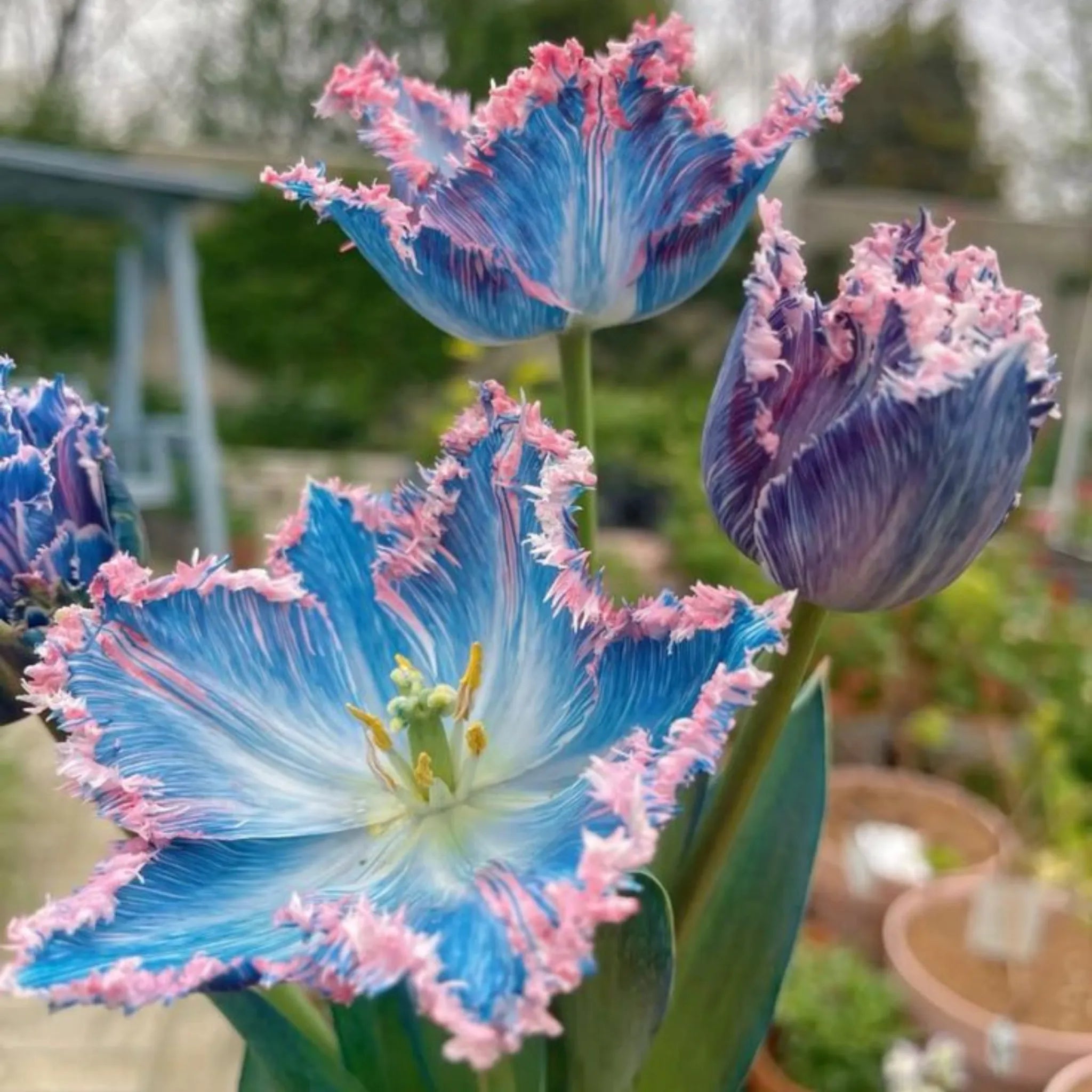 Bulbi Lalele Bellira impresionează prin eleganța florilor mari și catifelate, în nuanțe delicate de albastru intens, alb, accente mov și margini roz. Contrastul rafinat și forma grațioasă a petalelor dau un aer romantic și sofisticat.