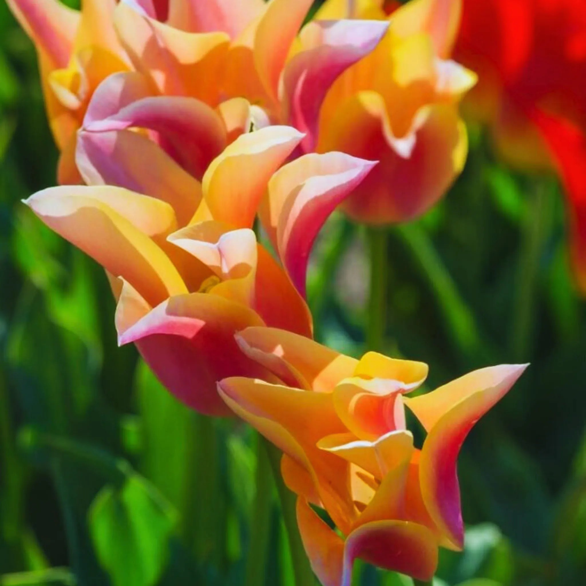 Bulbi Lalele Mysteria impresionează prin florile lor spectaculoase, cu petale catifelate într-un joc de culori calde și luminoase: portocaliu intens, galben auriu, roz delicat și accente roșii strălucitoare. Reflexiile luminoase de pe petale dau un aspect vibrant și sofisticat, transformând orice grădină într-un decor plin de energie și vitalitate.