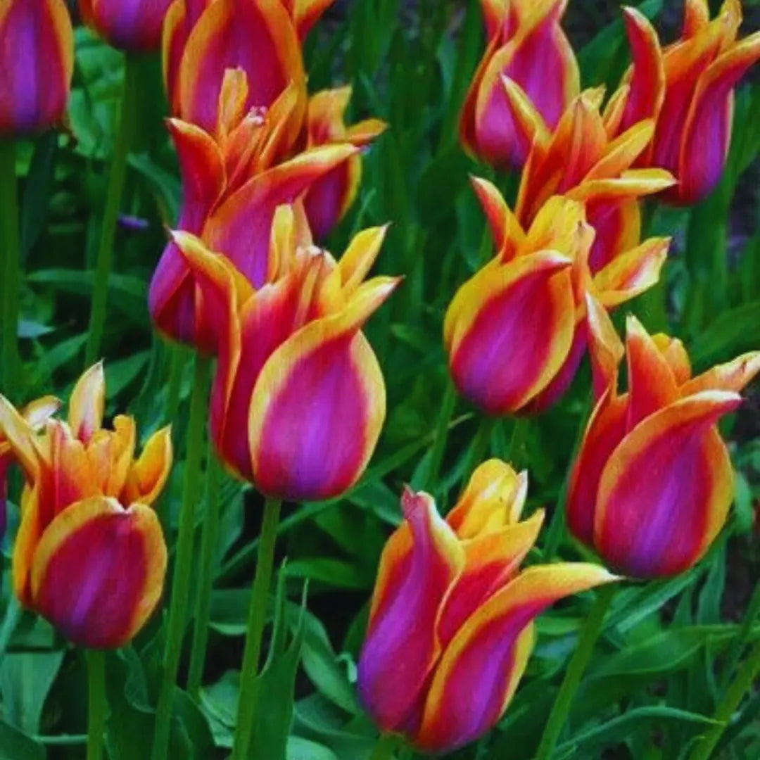 Bulbi Lalele Sylvara încântă privirea printr-un spectacol vibrant de culori, combinând roșu-purpuriu intens cu portocaliu aprins, galben auriu și accente rozalii fine. Florile au un aspect cald și luminos, cu petale catifelate ce par pictate în nuanțe de apus, oferind grădinii un aer plin de viață și eleganță. Planta are tulpini rezistente, frunziș sănătos și o înflorire abundentă, fiind ideală pentru borduri ornamentale, ronduri, ghivece decorative sau aranjamente florale deosebite.