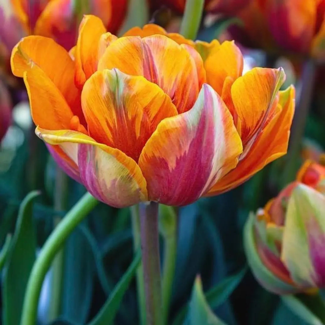 Bulbi Lalele Ventira aduc un spectacol de culoare impresionant în grădină, prin florile lor vibrante în nuanțe de portocaliu intens, galben auriu și roșu-purpuriu, completate armonios de accente verzi proaspete. Contrastul cald al tonurilor solare cu notele vegetale creează un efect vizual plin de energie, eleganță și echilibru natural. Planta are o creștere viguroasă, tulpini rezistente și o înflorire bogată, fiind ideală pentru borduri ornamentale, ronduri colorate, ghivece sau aranjamente florale pline de viață.