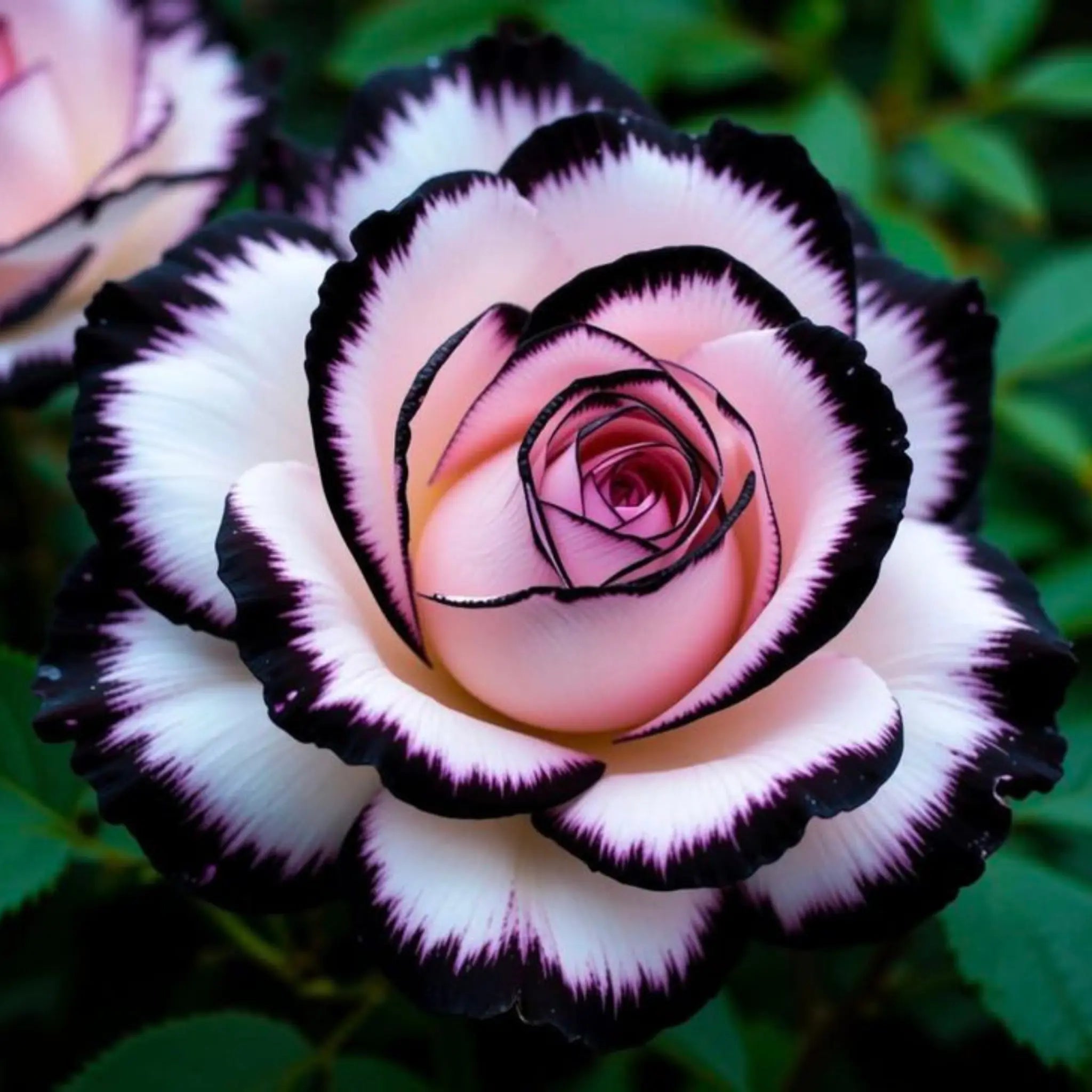Trandafiri Candy atrag atenția prin nuanțele lor jucăușe, luminoase și decorative. Florile sunt albe, cu margini negre-purpurii și un interior roz-caisă, petalele având accente contrastante. Forma este semi-dublă sau dublă, cu petale catifelate și flori care se deschid treptat.