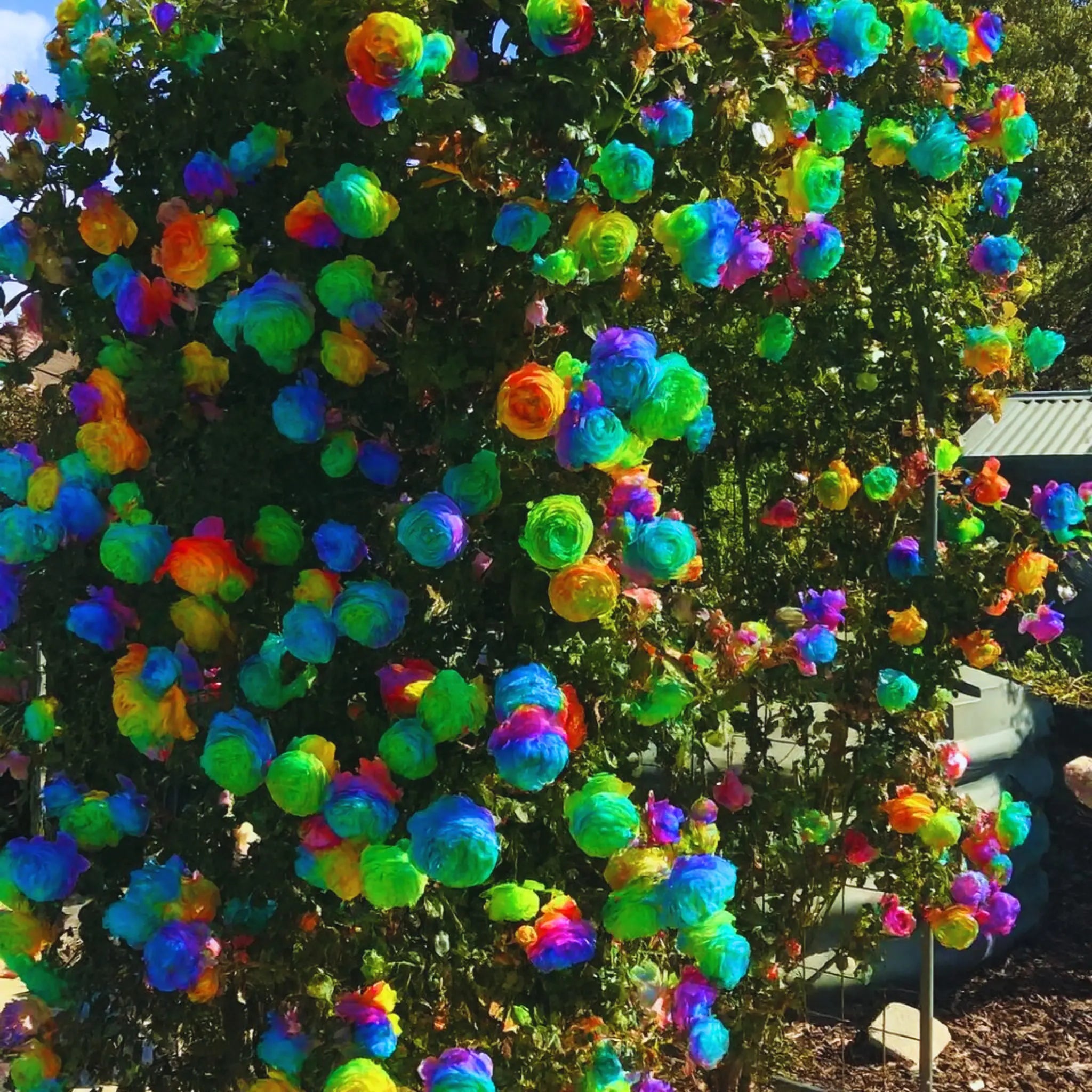 Trandafiri Cataratori Rainbow aduc un adevărat curcubeu de culoare în grădină. Florile lor catifelate, cu petale dispuse în degradeuri vii și strălucitoare de albastru, verde, galben, portocaliu, roșu, mov și accente roz, creează un efect vizual spectaculos și unic. Această varietate inedită transformă orice spațiu verde într-un colț de poveste, plin de energie, veselie și eleganță.